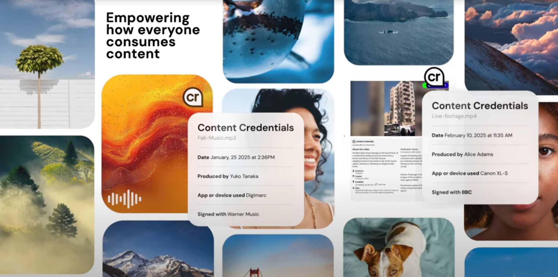 As Content Credentials são a materialização prática deste conceito para criadores e meios de comunicação. Funcionam como um rótulo digital, baseado no C2PA, que regista quem criou o conteúdo, quando, com que câmara ou software, que alterações foram feitas e se houve uso de IA generativa ou apenas IA de melhoria.