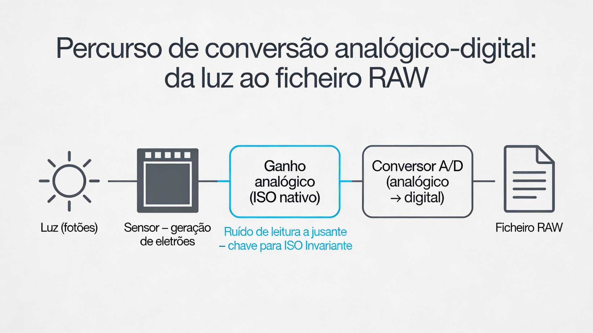 3. Conversor Analógico-Digital (A/D): O sinal é transformado em dados digitais. Acima do último patamar de ganho analógico real, qualquer aumento de ISO é apenas uma multiplicação digital, tornando-se tecnicamente redundante em ficheiros RAW.